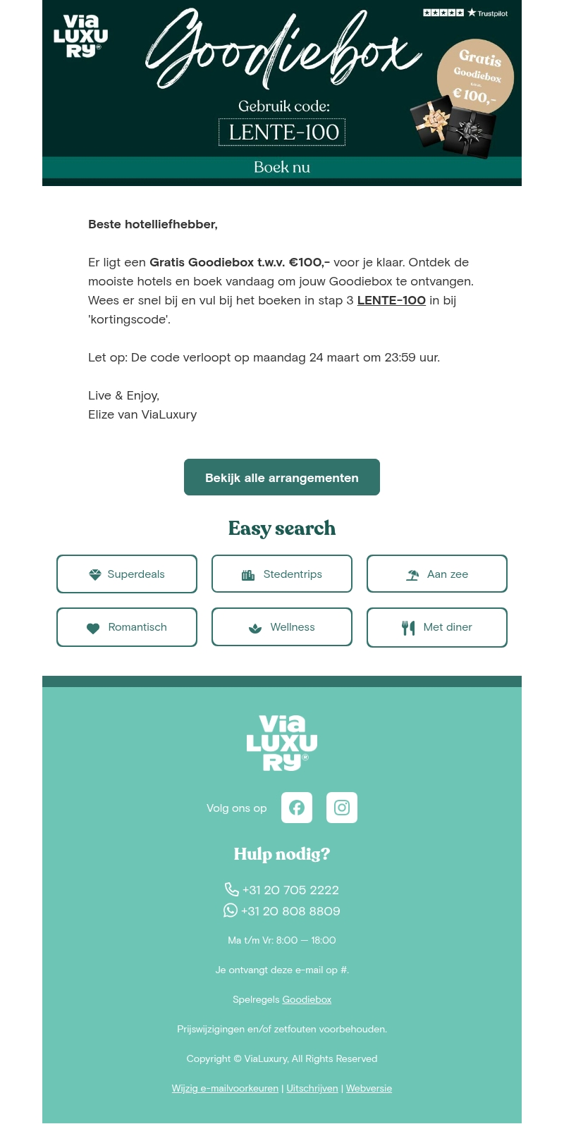 Ontvang een Gratis Goodiebox ter waarde van €100 als je vandaag een hotel boekt bij ViaLuxury. Vul de code LENTE-100 in bij je boeking en geniet van deze exclusieve aanbieding. Zorg ervoor dat je vóór 24 maart boekt om gebruik te maken van deze deal.