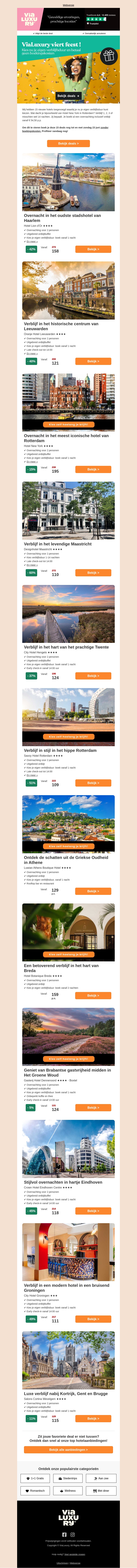 Ontdek de mooiste steden van Nederland zonder bijkomende boekingskosten. Van Amsterdam tot Maastricht, ViaLuxuR biedt je de mogelijkheid om stijlvol en voordelig te verblijven. Bekijk snel de aanbiedingen en boek je verblijf zonder extra kosten. Mis deze kans niet!