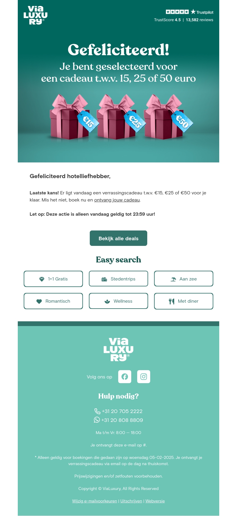 Gefeliciteerd hotellijfliefhebber! Je bent geselecteerd voor een verrassingscadeau ter waarde van β¬15, β¬25, of β¬50. Deze exclusieve aanbieding geldt alleen vandaag tot 23:59 uur. Boek nu en ontvang jouw cadeau bij thuiskomst. Bekijk alle deals op onze website en laat je verrassen.