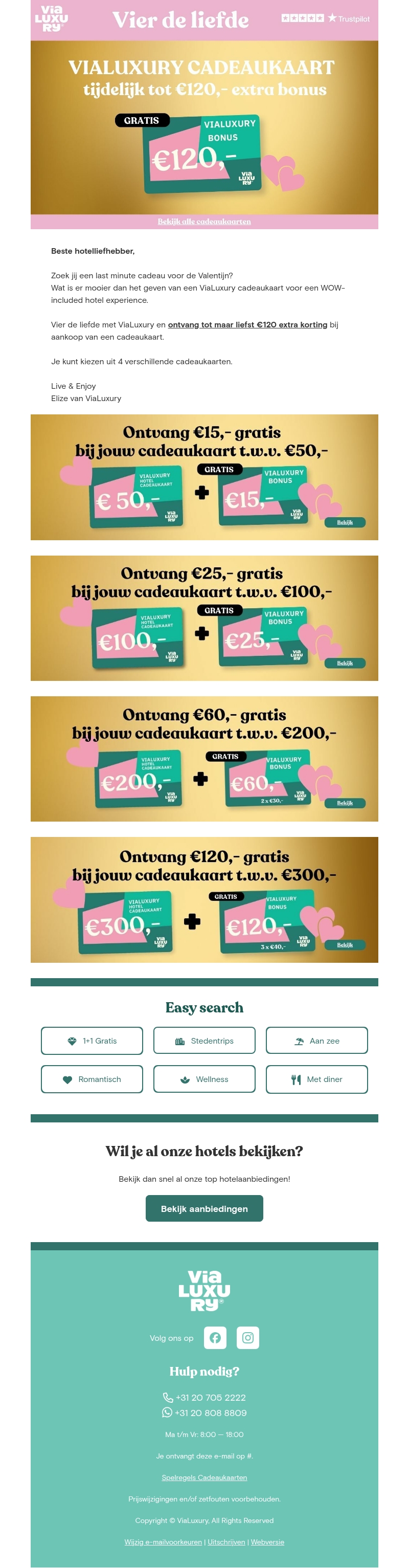 Verras je geliefde deze Valentijnsdag met een Vialuxury cadeaukaart en ontvang tot wel €120 gratis bonus. Kies uit vier verschillende cadeaukaarten en maak van een verblijf in een luxe hotel een onvergetelijke ervaring. Wacht niet en pak deze unieke aanbieding nu.