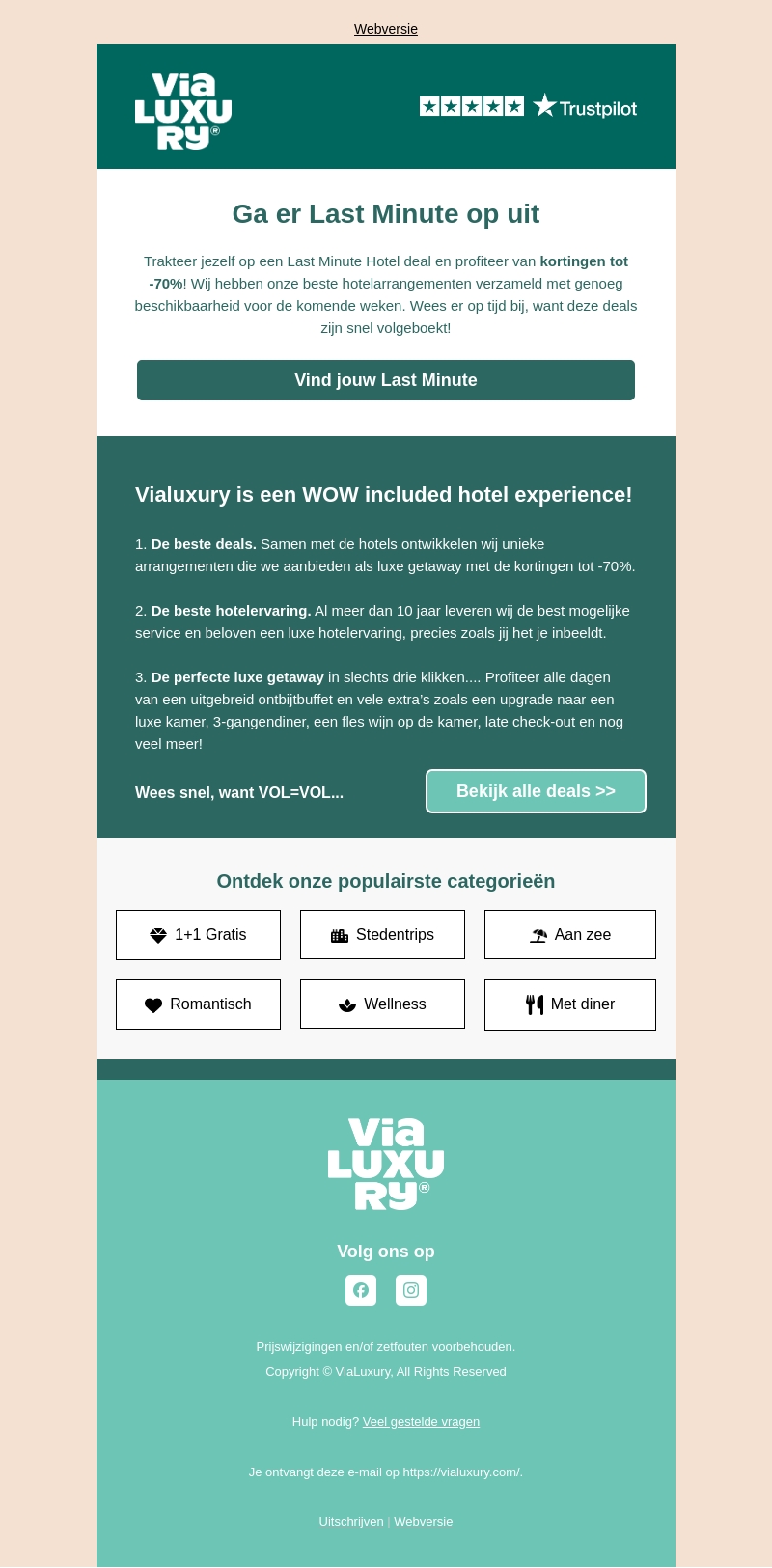 Trakteer jezelf op een last minute hotel deal met kortingen tot -70%! Geniet van unieke hotelarrangementen en luxe getaways. Vialuxury biedt de beste hotelervaring en service. Profiteer van upgrades, laat check-out en vele extra's. Wees er op tijd bij, want vol is vol!