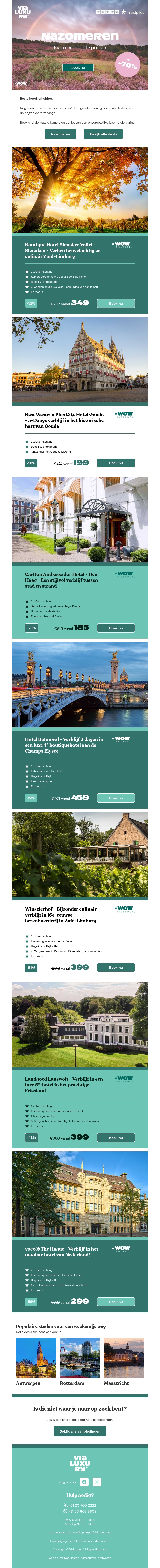 Profiteer van de exclusieve nazomer hotel deals en bespaar tot 70% op luxe verblijven. Ontdek prachtige bestemmingen zoals Limburg, Den Haag en Antwerpen. Wacht niet langer en boek nu jouw droomvakantie met mooie kortingen. Geniet van een comfortabele nazomer met extra verlaagde prijzen!