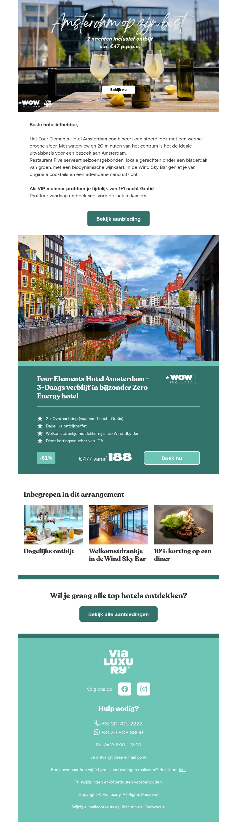 Bezoek Amsterdam en verblijf in het unieke Four Elements Hotel. Geniet van 2 nachten met ontbijt voor slechts €47 per persoon per nacht. Het hotel biedt een indrukwekkende watervue en ligt op slechts 20 minuten van het centrum. Ontspan in het restaurant met seizoensgebonden gerechten en geniet van een drankje in de Wind Sky Bar. Als VIP-lid profiteer je van 1+1 nacht gratis!