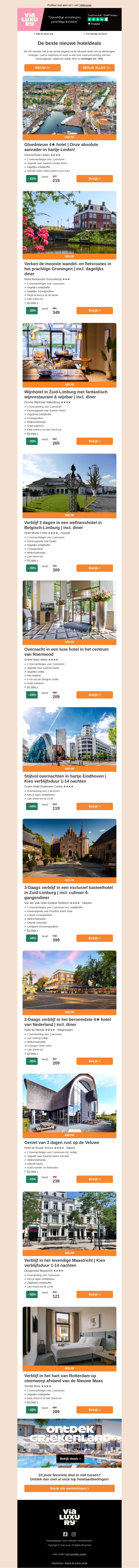 Duik in de nieuwste pareltjes met de beste hoteldeals. Ontdek prachtige steden zoals Leiden, Groningen, en Maastricht. Geniet van luxe voorzieningen en exclusieve aanbiedingen. Boek nu en ervaar een onvergetelijk verblijf!