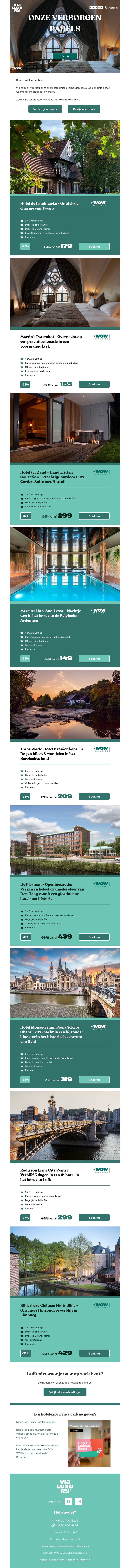 Ontdek de verborgen parels van luxe hotels en profiteer van exclusieve aanbiedingen. Geniet van de beste faciliteiten en betoverende uitzichten. Boek nu uw onvergetelijke ervaring en laat u verwennen tijdens uw verblijf. Deze nieuwsbrief onthult unieke locaties en bijzondere deals. Mis deze kans niet om in stijl te genieten.
