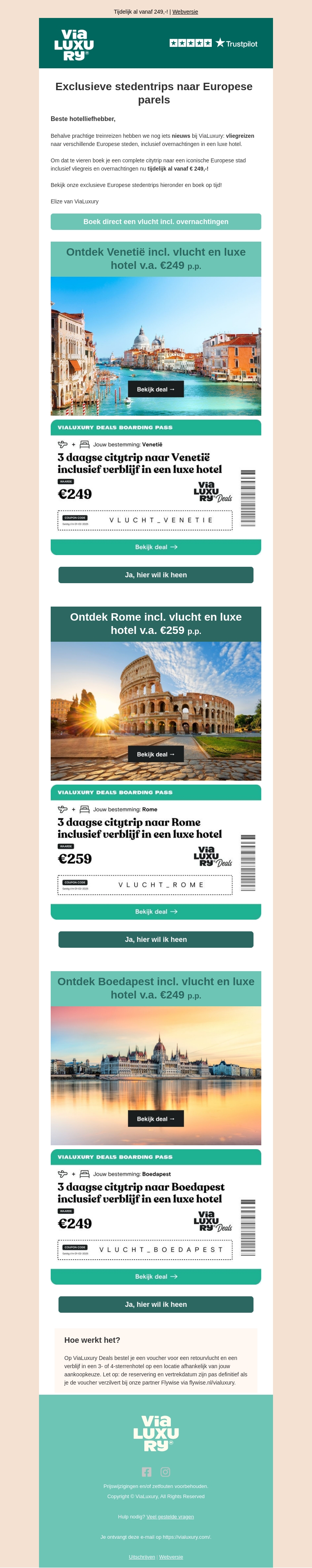 Beste hotelliefhebber, ontdek prachtige citytrips naar Venetië, Rome en Boedapest inclusief vlucht en luxe hotel. Boek nu een complete reis vanaf slechts €249 per persoon. Haal het maximale uit je stedentrip met onze exclusieve aanbiedingen.
