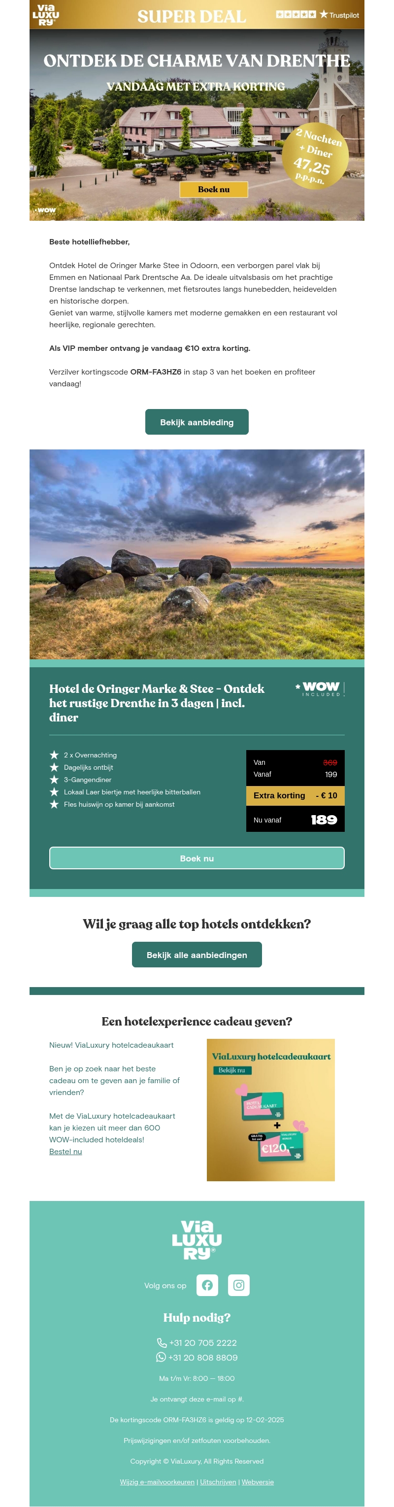 Beleef een unieke ervaring in het hart van Drenthe bij Hotel de Oringer Marke & Stee. Geniet van 2 nachten inclusief diner voor slechts €47,25 p.p.p.n. als VIP-lid. Verken de prachtige omgeving met fietsroutes langs hunebedden en proef heerlijke regionale gerechten in het hotelrestaurant.