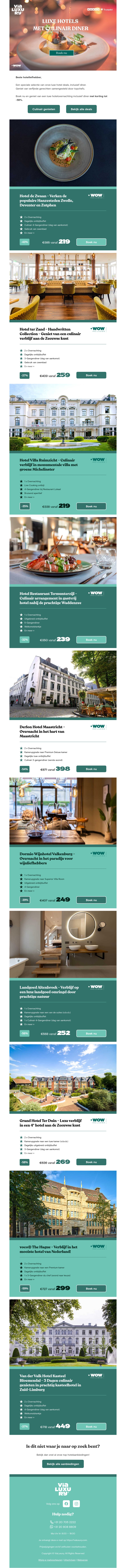 Geniet van exclusieve kortingen tot 59% op luxe hotels inclusief diner. Uitstekende aanbiedingen voor een onvergetelijk verblijf. Bezoek verschillende prachtige locaties en ervaar luxe service en eetgelegenheden. Boek snel om te profiteren van deze beperkte aanbiedingen!