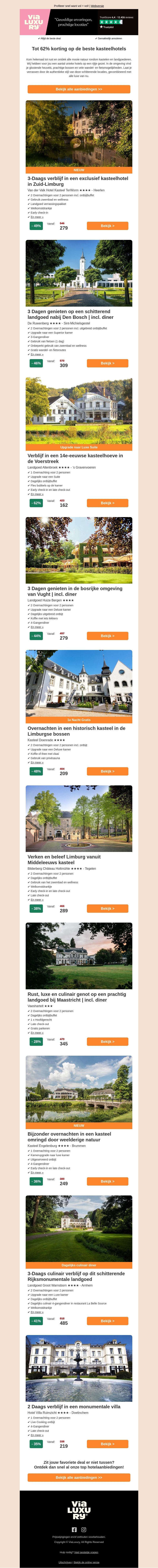 Geniet van een heerlijk verblijf in prachtige kasteelhotels met kortingen tot wel 62%. Ervaar luxe accommodaties, culinaire hoogstandjes en adembenemende omgevingen. Boek nu een unieke ervaring in Zuid-Limburg, Den Bosch, of een andere betoverende locatie, inclusief diner en ontbijt.