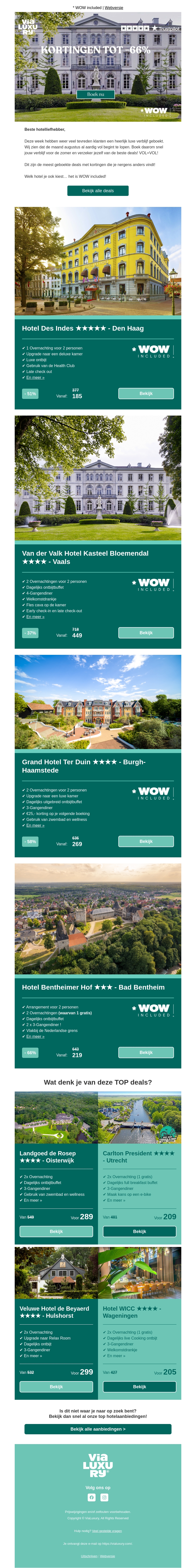 Deze week bieden wij kortingen tot 66% op luxe hotels op prachtige locaties in Nederland en Duitsland. Geniet van speciale arrangementen inclusief ontbijt en toegang tot wellnessfaciliteiten. Wees snel, want vol=vol!