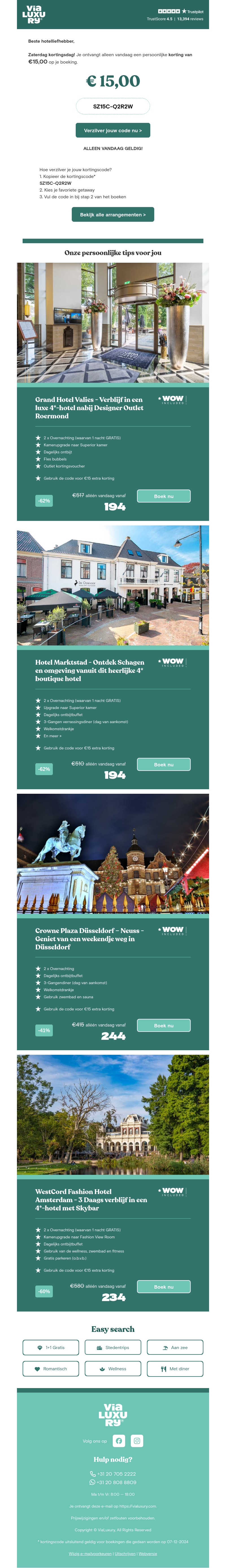 Ontvang alleen vandaag een korting van β¬15 op je boeking bij ViaLuxury. Gebruik de code SZ15C-Q2R2W om te profiteren van deze aanbieding. Verblijf in luxe 4*-hotels in steden zoals Roermond, Schagen, en DΓΌsseldorf. Boek snel en geniet van exclusieve deals en verblijven.