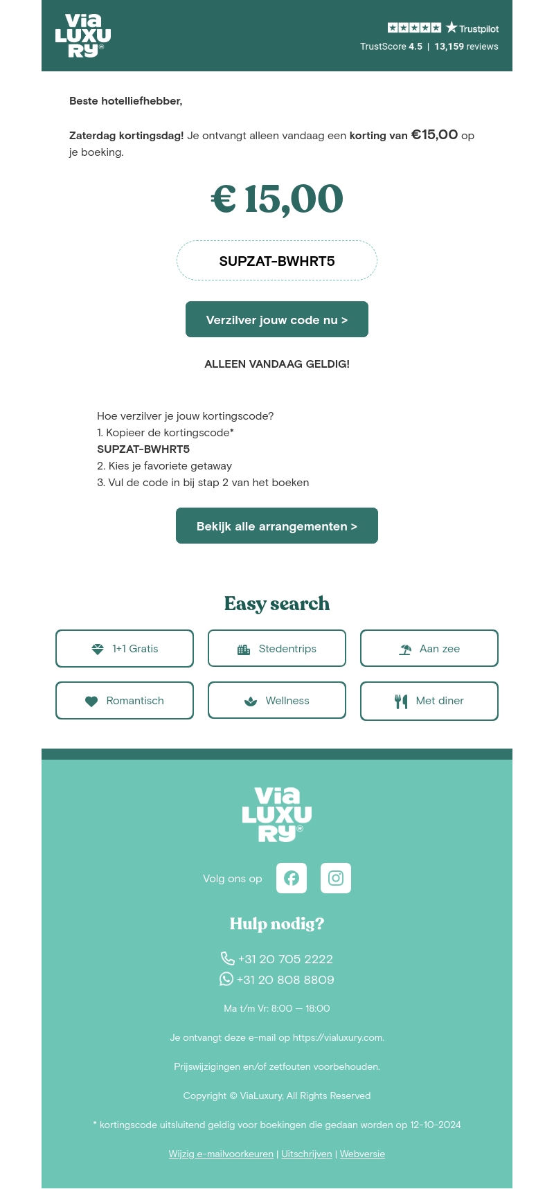Beste hotelliiefhebber, alleen vandaag ontvang je een korting van β¬15 op je boeking bij ViaLuxury. Gebruik de kortingscode SUPZAT-BWHRT5 om te profiteren van deze exclusieve aanbieding. Kies je favoriete getaway en vul de code in bij stap 2 van het boeken. Deze actie is maar één dag geldig, dus wacht niet te lang!