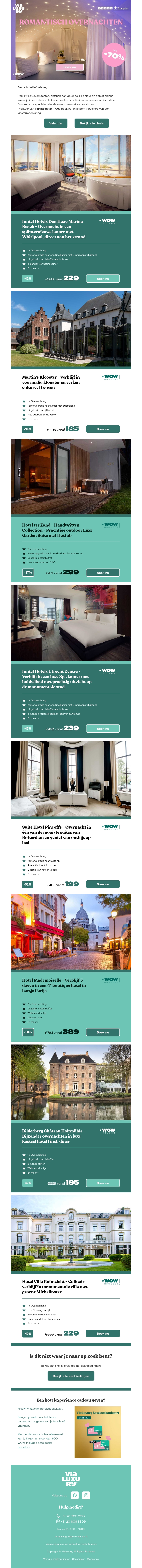 Geniet van een romantisch verblijf in een van onze speciaal geselecteerde hotels. Boek je overnachting met korting en creëer onvergetelijke herinneringen met je geliefde. Ontdek prachtige locaties, luxe voorzieningen en verrassende extra's voor een onvergetelijk verblijf. Verwen jezelf en je partner met een romantische escape.
