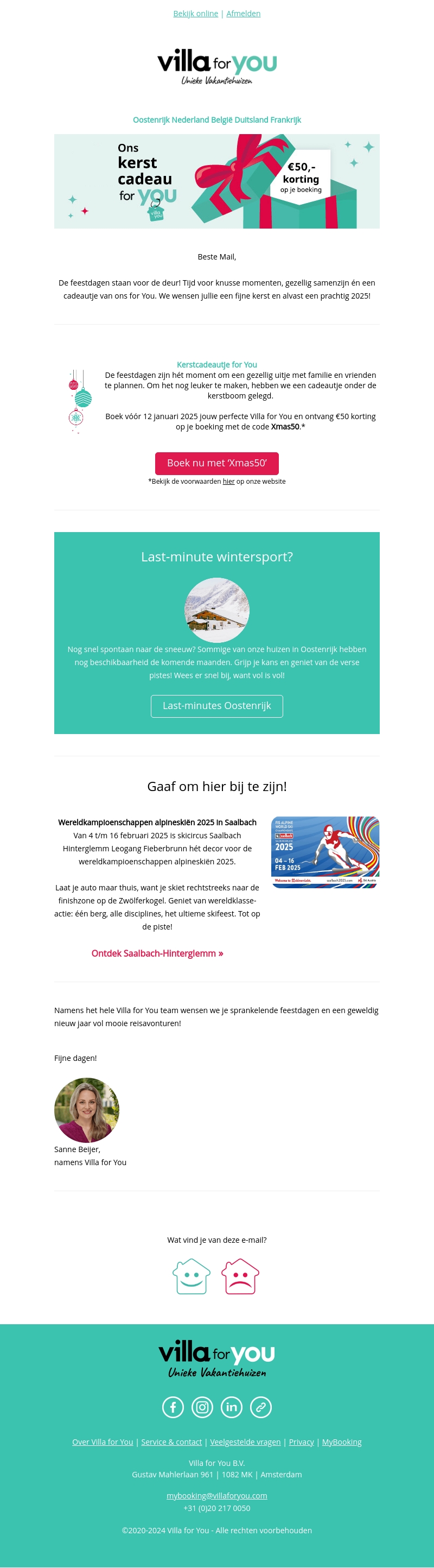 De feestdagen komen eraan, en Villa for You heeft een speciaal kerstcadeau voor jou! Boek je vakantie voor 12 januari 2025 en ontvang β¬50 korting met de code Xmas50. Geniet van last-minute wintersportopties in Oostenrijk en ontdek de wereldkampioenschappen alpin skiΓ«n in Saalbach. Plan nu je perfecte winteruitje!
