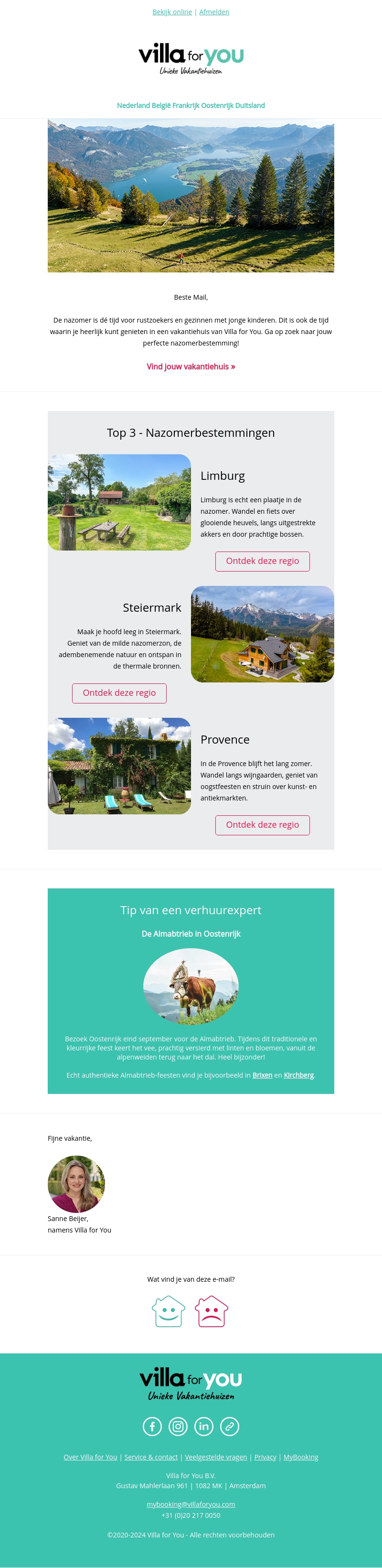 De nazomer is het perfecte moment om te genieten van een vakantiehuis met Villa for You. Ontdek onze top 3 nazomerbestemmingen: Limburg, Steiermark, en Provence. Maak je hoofd leeg, geniet van de natuur en ontspan in een van onze prachtige vakantiehuizen. Boek nu jouw perfecte nazomervakantie!