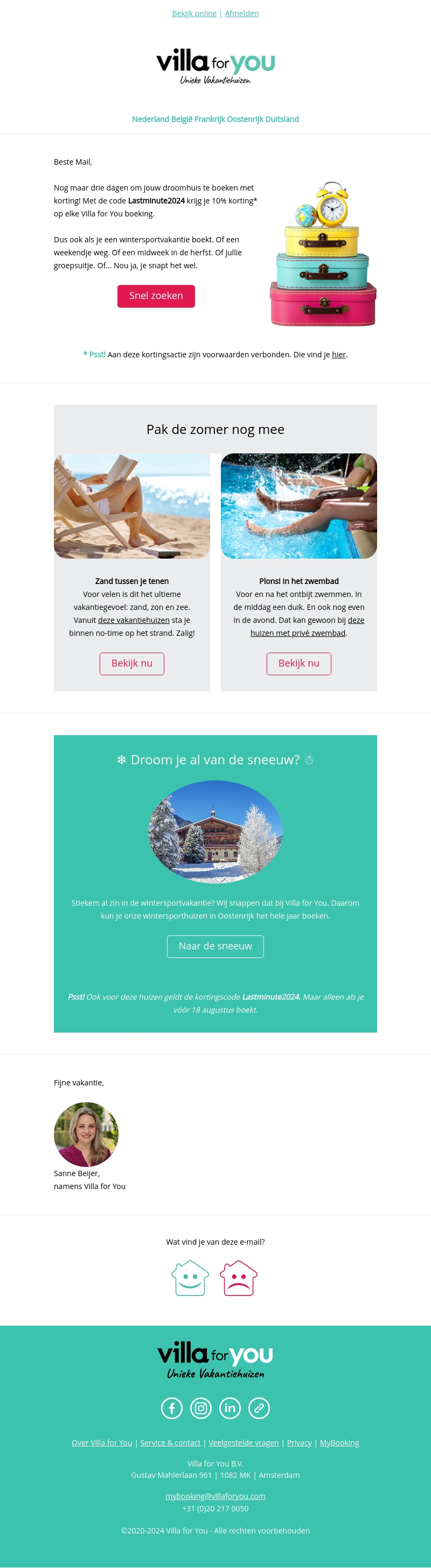Beste lezer, je hebt nog maar drie dagen om jouw droomhuis te boeken met korting bij Villa for You. Met de code Lastminute2024 ontvang je 10% korting op elke boeking. Of je nu op zoek bent naar een zomervakantie of een wintersportvakantie, er is voor ieder wat wils. Mis deze kans niet!