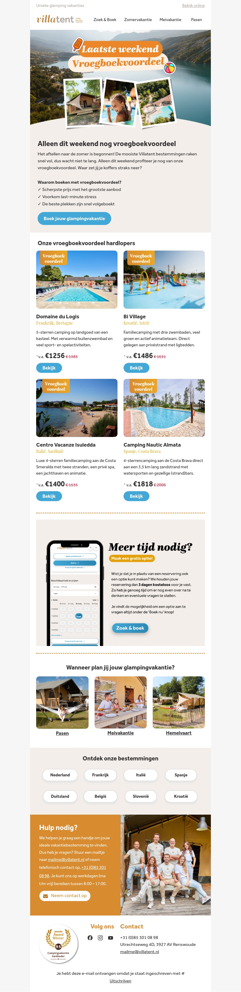 Het is het laatste weekend voor vroegboekvoordeel bij Villatent! Profiteer nu van scherpe prijzen en ruime keus uit prachtige bestemmingen. Boek jouw droom glampingvakantie in verschillende Europese landen. Ontdek de charme en luxe van onze accommodaties. Wacht niet langer en verzeker jezelf van een onvergetelijke vakantie.