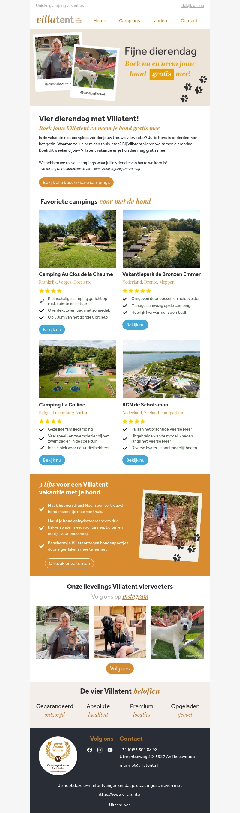 Vier Dierendag met Villatent en neem je trouwe viervoeter gratis mee op vakantie. Geniet van de rust en schoonheid van onze campings, met voorzieningen speciaal afgestemd op het gezin en hun honden. Boek nu en beleef een onvergetelijke vakantie samen met je hond. Ontdek verscheidene topcampings in binnen- en buitenland waar honden welkom zijn. Mis deze unieke kans niet om samen avonturen te beleven in de natuur.