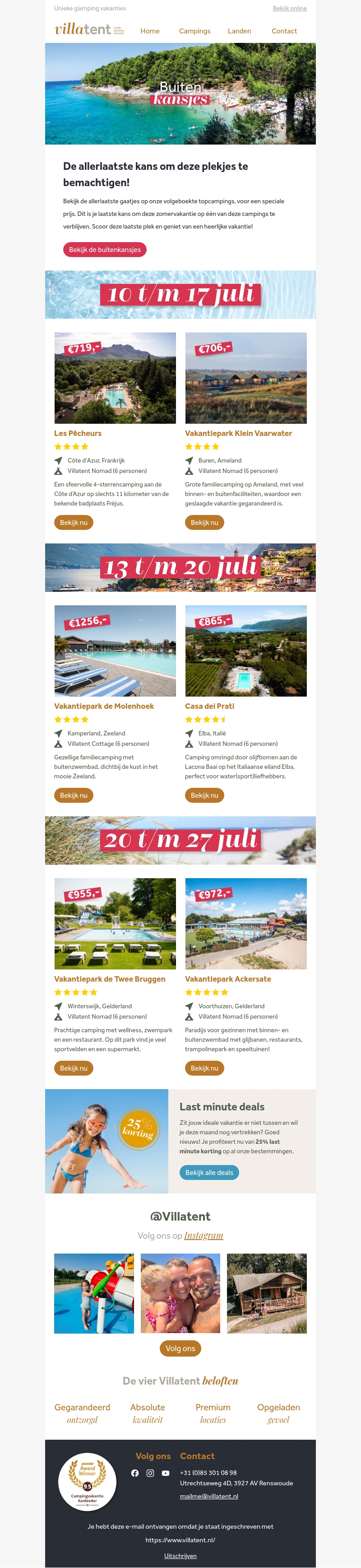 Bekijk de nieuwste aanbiedingen van Villatent en mis de laatste kansjes niet! Geniet van unieke glamping ervaringen op prachtige locaties. Ontdek de topcampings van Frankrijk, Nederland en Italië en boek jouw verblijf voor een geweldige prijs! Profiteer vandaag nog van deze exclusieve deals!