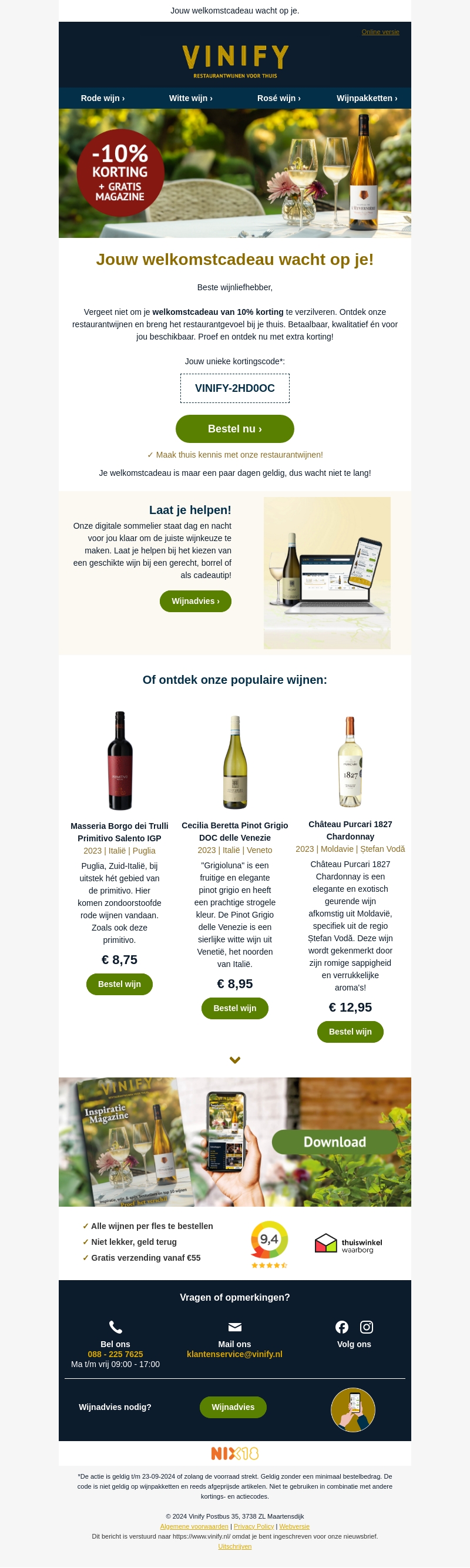 Vergeet niet om je welkomstcadeau van 10% korting te verzilveren bij Vinify. Ontdek onze restaurantwijnen en breng het restaurantgevoel bij je thuis. Betaalbaar, kwalitatief en voor jou beschikbaar. Maak nu kennis met onze uitstekende wijnen en geniet van extra korting!