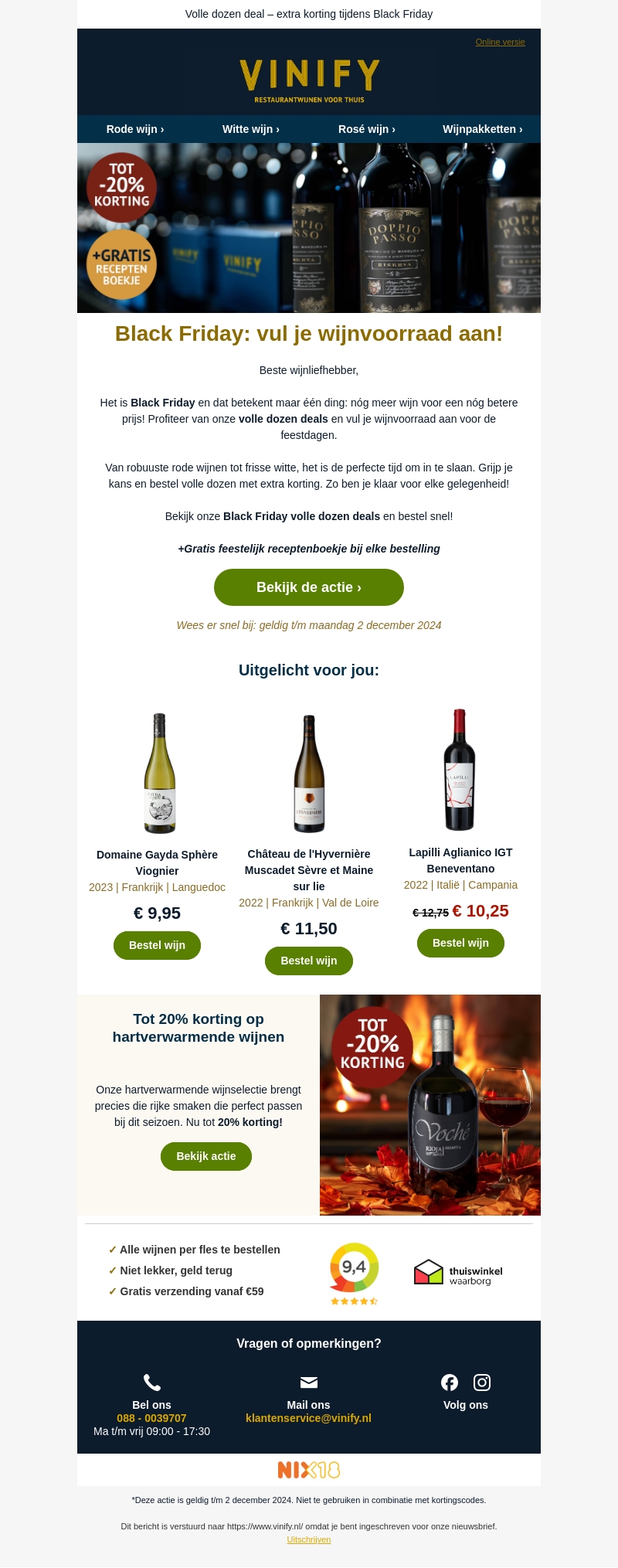 Profiteer van onze volle dozen deals tijdens Black Friday en vul je wijnvoorraad aan voor de feestdagen. Ontvang tot 20% korting en een gratis feestelijk receptenboekje bij elke bestelling. Haast je, de actie is geldig tot 2 december 2024.