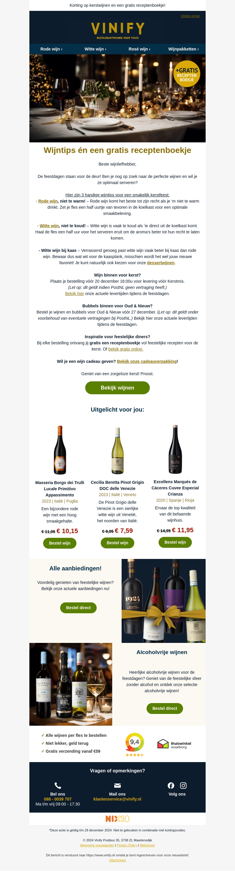 Bij Vinify staan de feestdagen in het teken van de beste wijnen. Ontvang waardevolle wijntips en een gratis receptenboekje om je kerstdiner te verrijken. Zorg ervoor dat je wijn op tijd bestelt voor de feestdagen en profiteer van speciale aanbiedingen. Verken ook ons aanbod aan alcoholvrije wijnen, perfect voor een sfeervolle avond. Haal het beste uit je kerst met onze zorgvuldig geselecteerde wijnaanbevelingen.