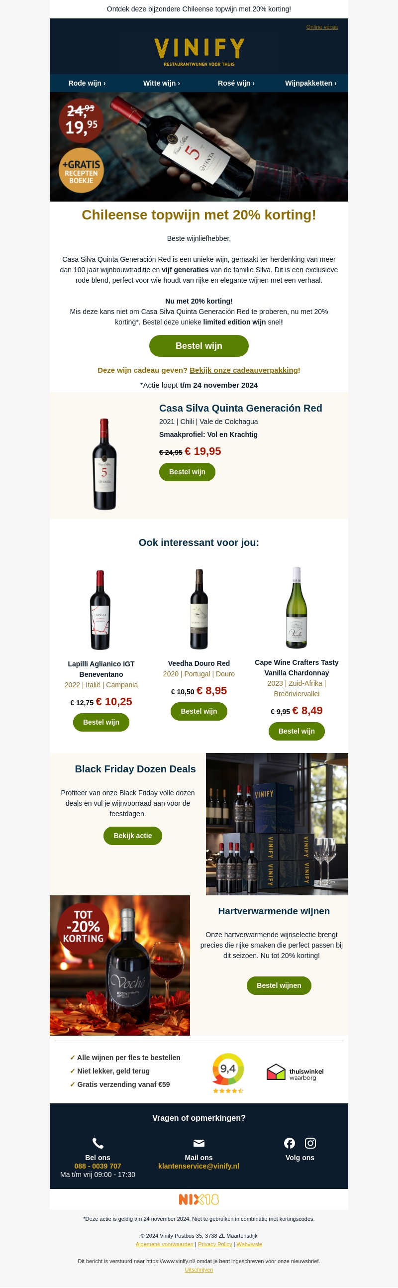 Casa Silva Quinta Generación Red is een unieke wijn die de traditie van vijf generaties viert. Geniet van een rijke en elegante wijn met een speciale 20% korting. Mis deze kans niet om deze limited edition wijn te proeven en ontdek de kracht van Chileense vinificatie. De aanbieding is geldig tot 24 november 2024. Ideaal als cadeau of voor eigen genot.