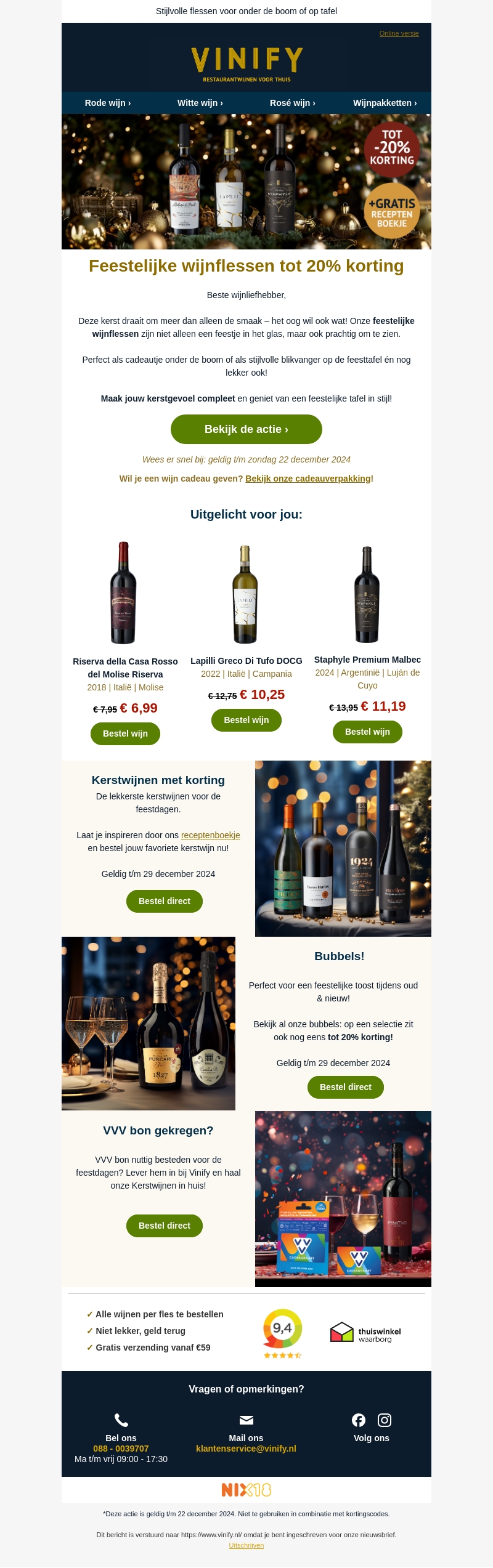 Ontdek de feestelijke wijnflessen van Vinify met kortingen tot 20%. Perfect voor onder de kerstboom of op tafel! Kies uit een selectie rode, witte en mousserende wijnen om in de feeststemming te komen. Beschikbaar tot en met 22 december 2024. Bestel nu en geniet van een stijlvolle kersttafel.
