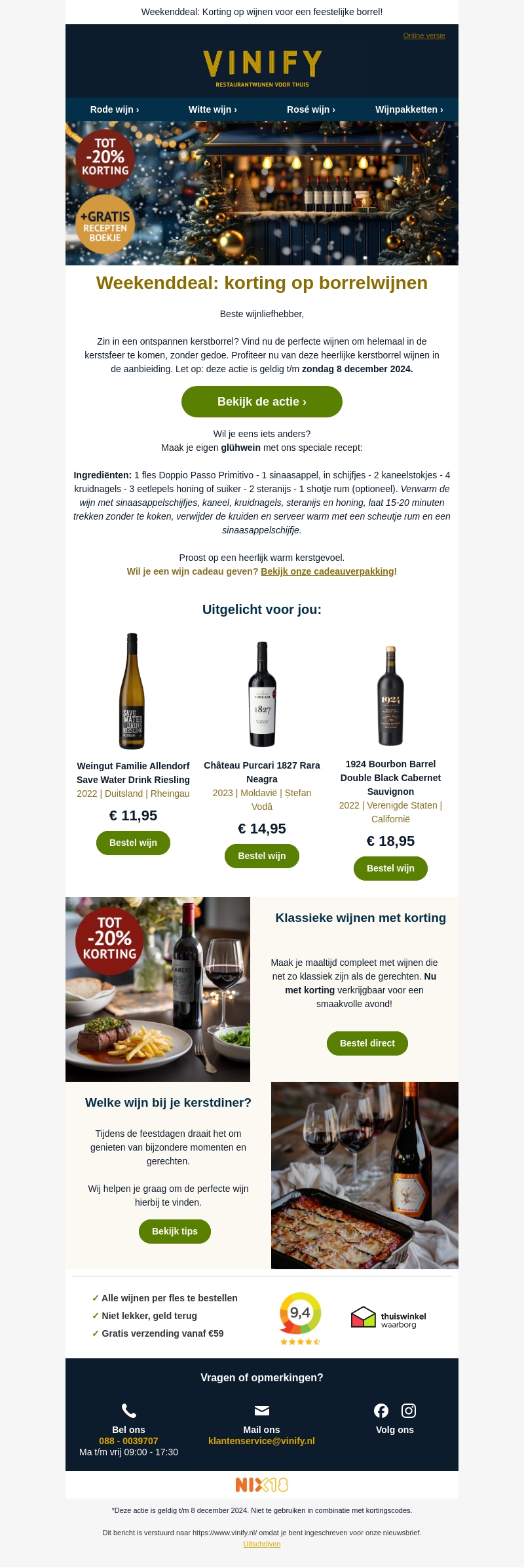 Deze weekenddeal biedt jou de mogelijkheid om te genieten van heerlijke wijnen met een korting tot 20%. Maak je kerstborrel compleet met deze zorgvuldig geselecteerde wijnen. Ontdek de speciale recepten om je eigen glühwein te maken en krijg een gratis receptenboekje. Let op, de aanbieding is geldig tot en met 8 december 2024. Mis deze kans niet en maak je feestdagen extra speciaal!