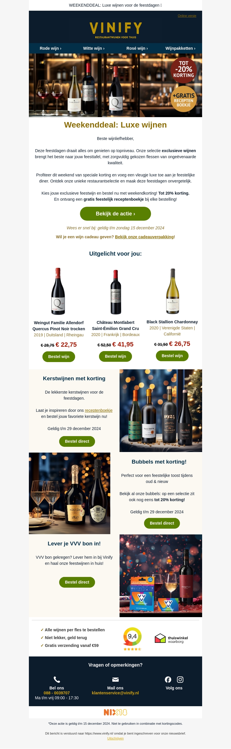 Vier de feestdagen met een selectie van luxe wijnen en geniet van tot 20% korting. Kies uit zorgvuldig geselecteerde flessen uit top wijnhuizen en ontvang een gratis feestelijk receptenboekje bij elke bestelling. Deze aanbieding is geldig tot zondag 15 december 2024. Mis het niet en bestel nu je favoriete feestwijn!