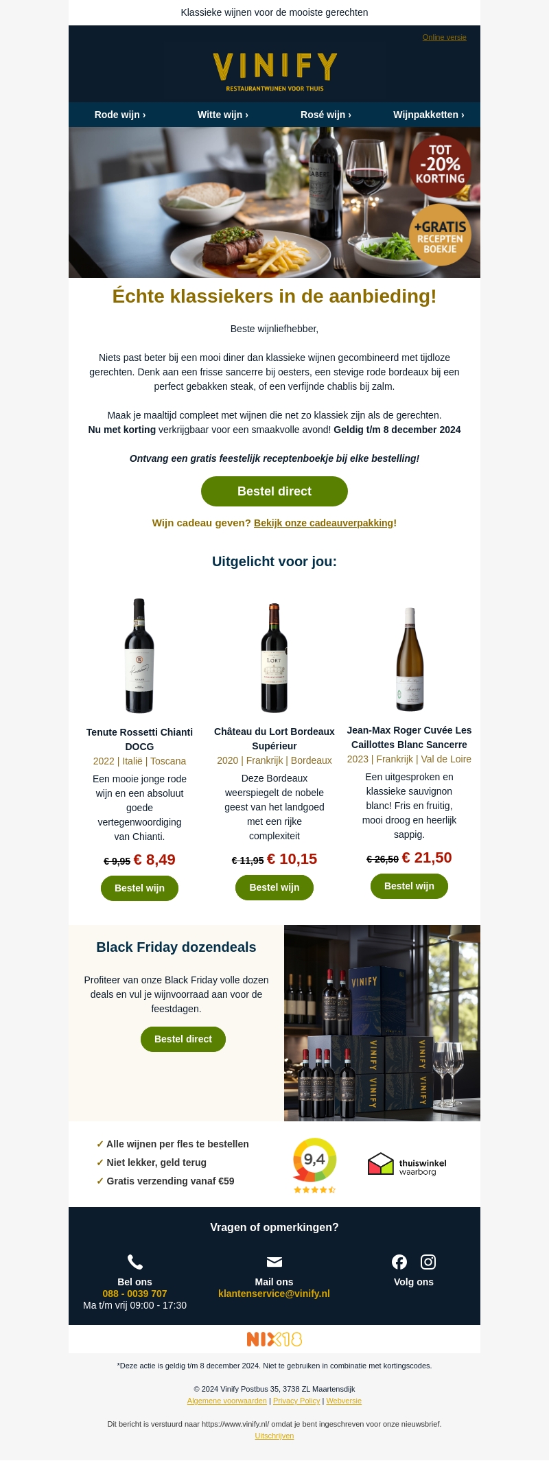 Ontdek klassieke wijnen met tot 20% korting bij Vinify. Perfect voor bij een heerlijke maaltijd. Actie is geldig tot en met 8 december 2024. Ontvang een gratis receptenboekje bij elke bestelling. Bezoek ons en verrijk uw wijnervaring met speciale Black Friday dozenaanbiedingen.