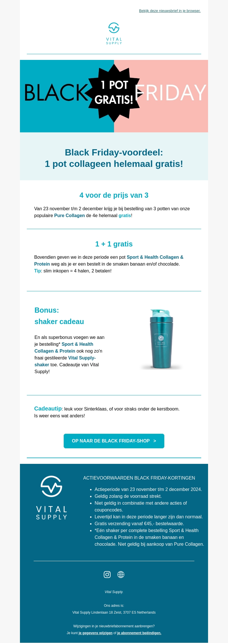 Deze Black Friday biedt Vital Supply een geweldige deal aan: bij aankoop van drie potten Pure Collagen krijgt u de vierde gratis! Bovendien ontvangt u bij elke bestelling van Sport & Health Collagen & Protein een extra pot gratis. Als extra bonus voegt Vital Supply een stijlvolle shaker aan uw bestelling toe.