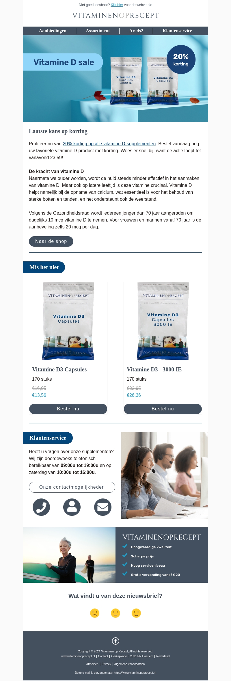 Profiteer nu van 20% korting op alle Vitamine D supplementen en versterk je gezondheid. Deze aanbieding geldt tot vanavond 23:59, dus wees er snel bij! Vitamine D is essentieel voor sterke botten en tanden. Het ondersteunt de opname van calcium en verbetert de weerstand. Grijp je kans en bespaar op je favoriete Vitamine D producten. Bezoek onze website voor meer details.