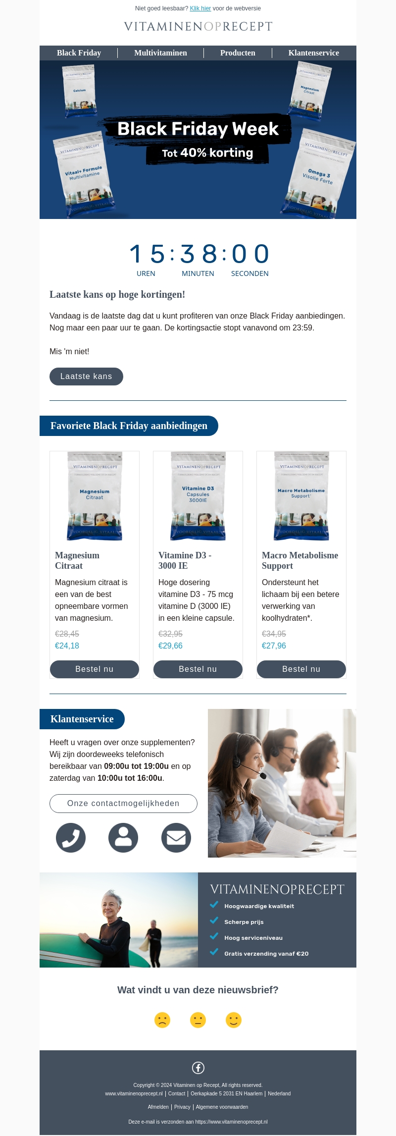 Mis de laatste kans op Black Friday kortingen bij VitaminenOpRecept! Tot 40% korting op onze topproducten. Eindigt vanavond om 23:59 uur, dus wees er snel bij. Ontdek de beste deals op magnesium, Vitamine D3 en meer. Klantenservice beschikbaar voor al uw vragen. Bestel nu voor de beste prijs!