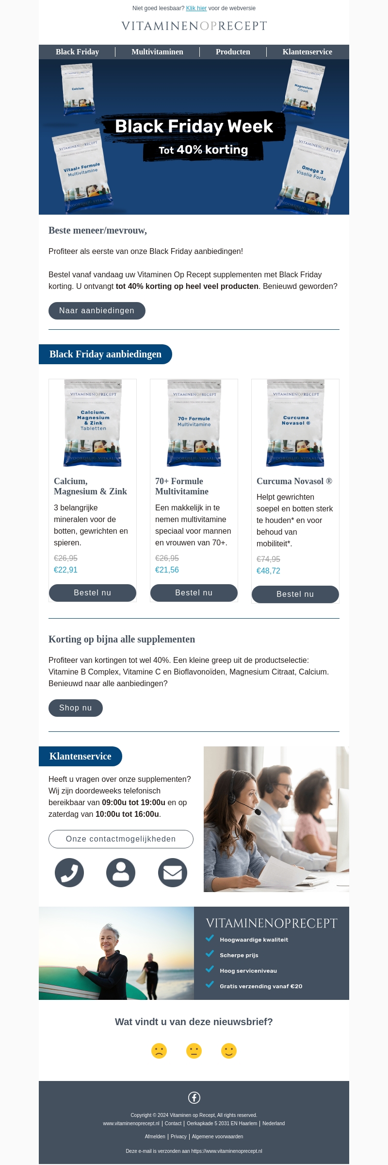VitaminenOpRecept biedt spectaculaire aanbiedingen tijdens de Black Friday Week. Krijg tot wel 40% korting op een breed assortiment van supplementen. Mis deze kans niet om hoogwaardige producten te kopen tegen ongekende prijzen. Ons assortiment omvat Calcium, Magnesium & Zink, 70+ Formule Multivitamine en Curcuma Novasol. Blijf gezond en bespaar tegelijkertijd.