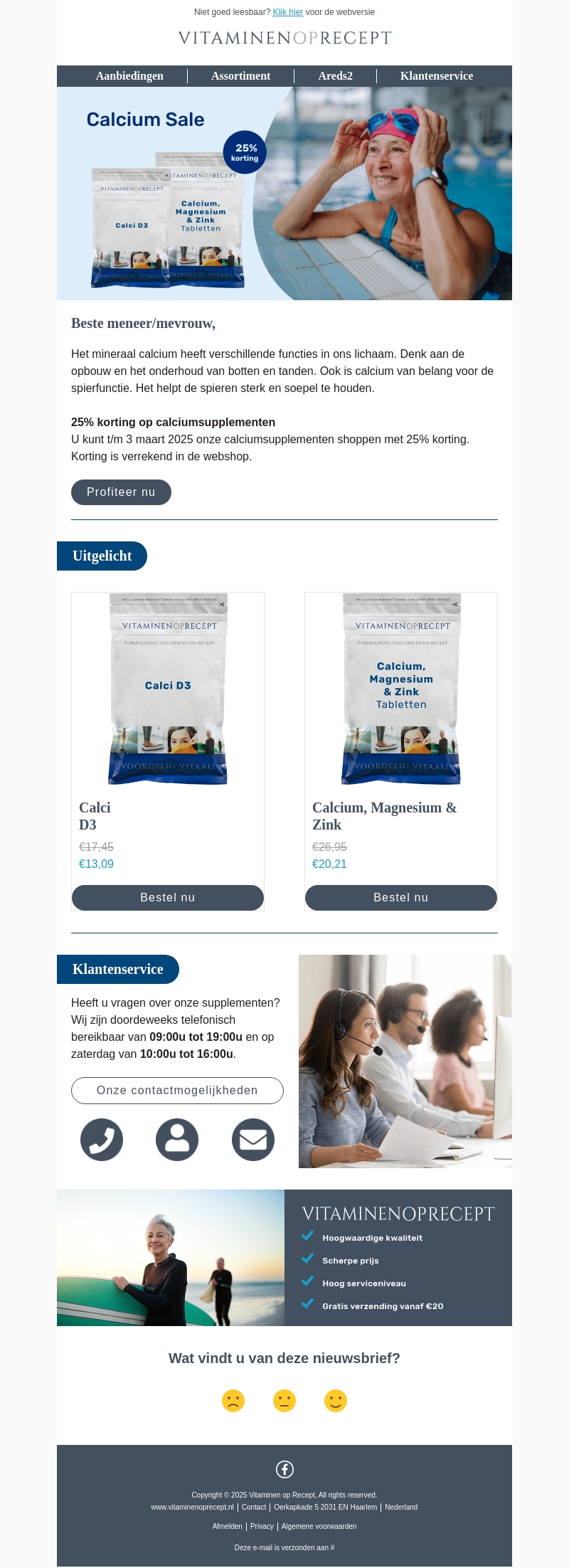 Deze week biedt Vitaminen op Recept een geweldige kans om uw gezondheid te ondersteunen met 25% korting op al hun calciumsupplementen. Of u nu behoefte heeft aan Calci D3 of een combinatie van Calcium, Magnesium en Zink, er is een ideaal supplement voor u. Profiteer van deze aanbieding tot 3 maart 2025 en versterk uw botten en spieren.