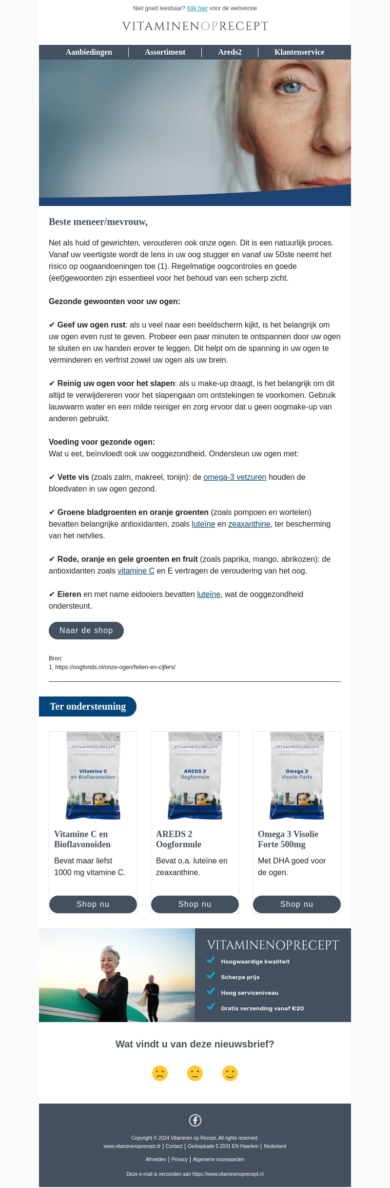 Onze ogen verouderen net als onze huid en gewrichten. Het is belangrijk om op elke leeftijd goede zorg te dragen voor onze ogen. In deze nieuwsbrief delen we essentiële voedingstips die helpen bij het onderhouden van scherp zicht en ooggezondheid. Leer hoe omega-3 vetzuren en kleurrijke groenten uw ogen kunnen ondersteunen. Blader door ons aanbod van gespecialiseerde supplementen die u hierin kunnen bijstaan.