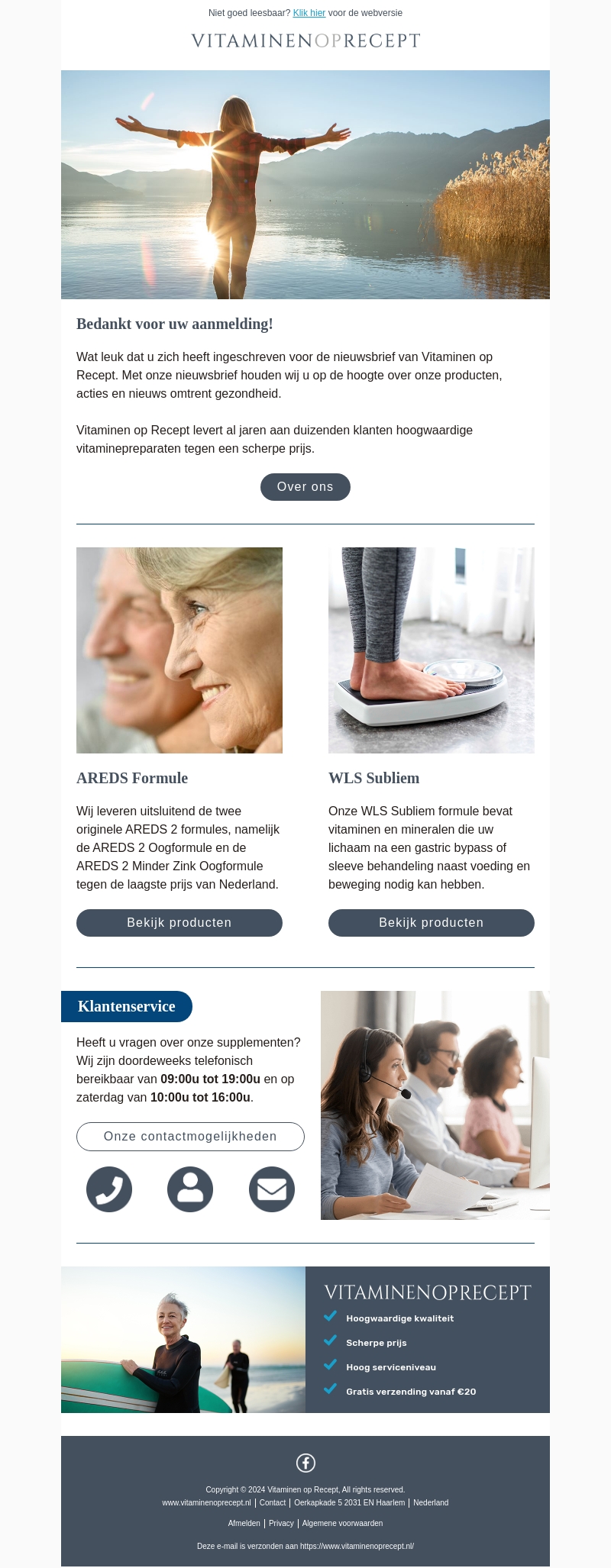Bedankt voor uw inschrijving voor de nieuwsbrief van Vitaminen op Recept. We houden u op de hoogte van onze producten, acties en nieuws omtrent gezondheid. Vitaminen op Recept levert al jaren hoogwaardige vitaminepreparaten tegen scherpe prijzen.