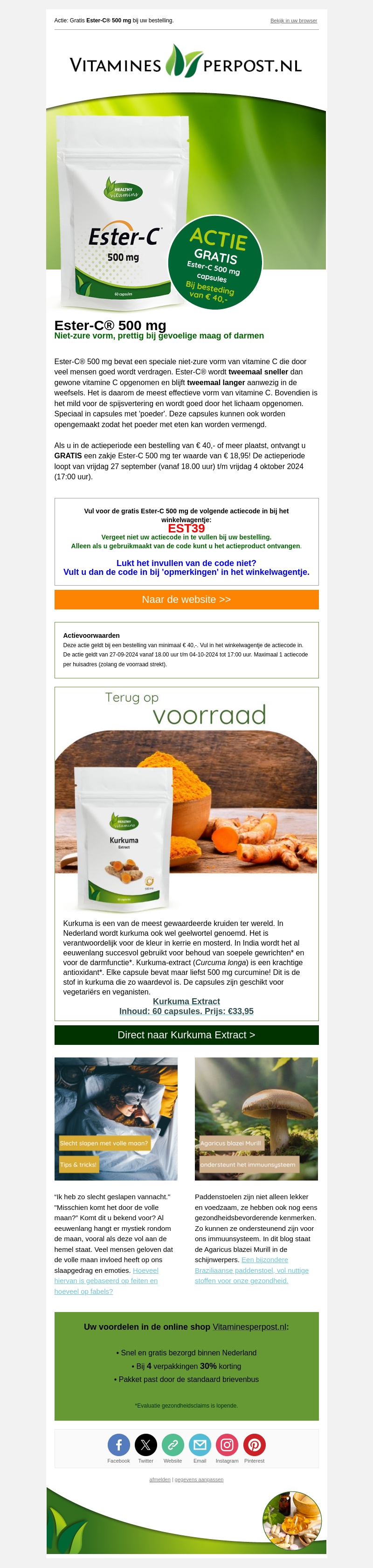 Ontvang GRATIS Ester-C® 500 mg bij uw bestelling vanaf €40. Ester-C® is een niet-zure vorm van vitamine C die mild is voor de maag en darmen. Speciale actie geldig tot 4 oktober 2024. Gebruik kortingscode EST39 bij het afrekenen.