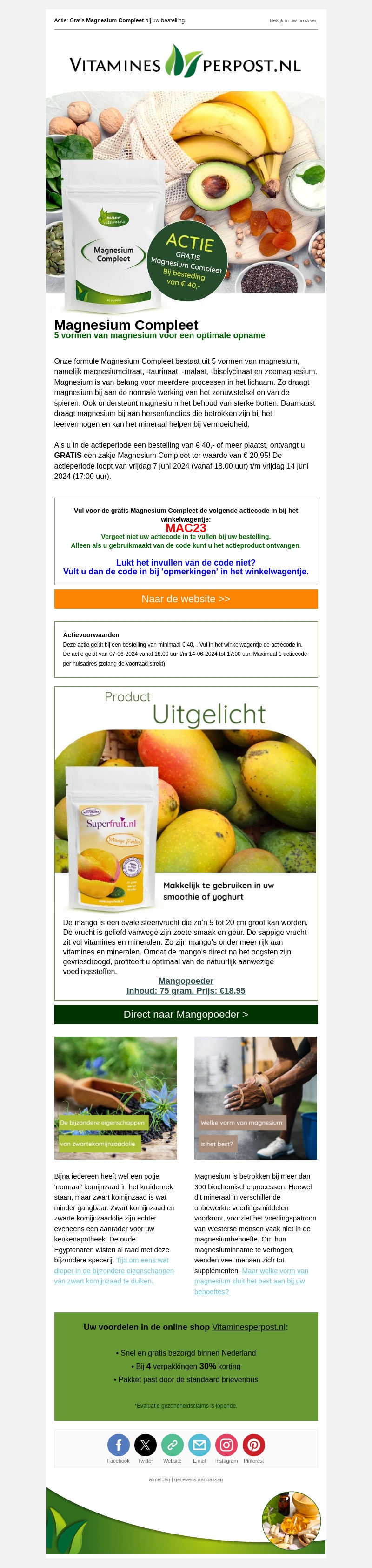 Ontvang gratis Magnesium Compleet bij een bestelling van € 40,- of meer bij Vitaminesperpost.nl. Dit supplement bevat 5 vormen van magnesium voor een optimale opname. De actie geldt van vrijdag 7 juni 2024 tot en met vrijdag 14 juni 2024. Gebruik de code MAC23 in uw winkelwagentje om de actie te activeren. Mis deze kans niet en verbeter uw gezondheid met deze geweldige aanbieding!