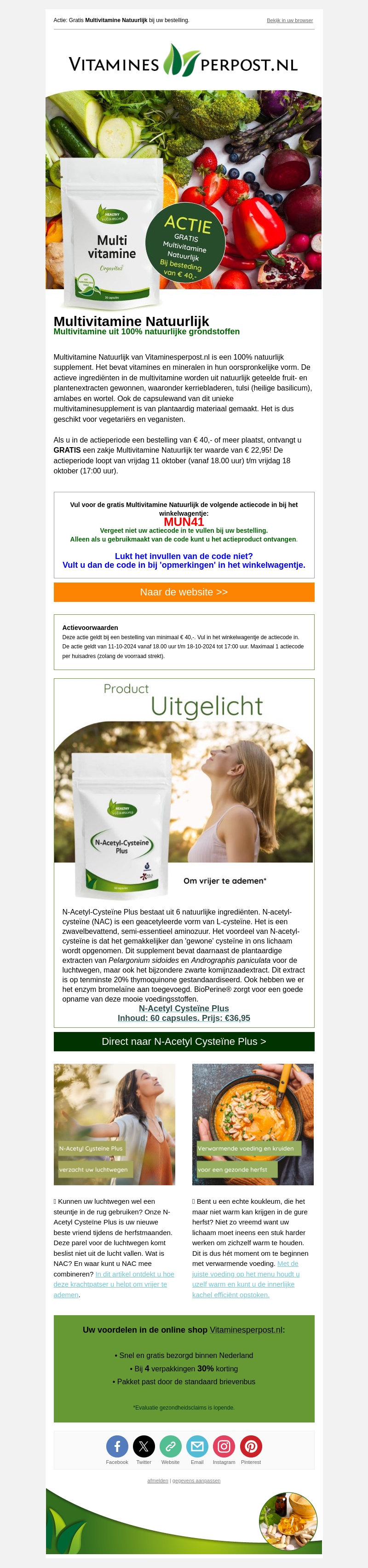 Deze nieuwsbrief van Vitaminesperpost.nl biedt een gratis zakje Multivitamine Natuurlijk bij een bestelling vanaf €40. Dit multivitaminesupplement bevat 100% natuurlijke ingrediënten, perfect voor vegetariërs en veganisten. De actie loopt van 11 oktober tot 18 oktober. Gebruik code MUN41 om direct te profiteren. Voeg nu de multivitaminen aan je winkelwagentje toe en geniet van de voordelen.
