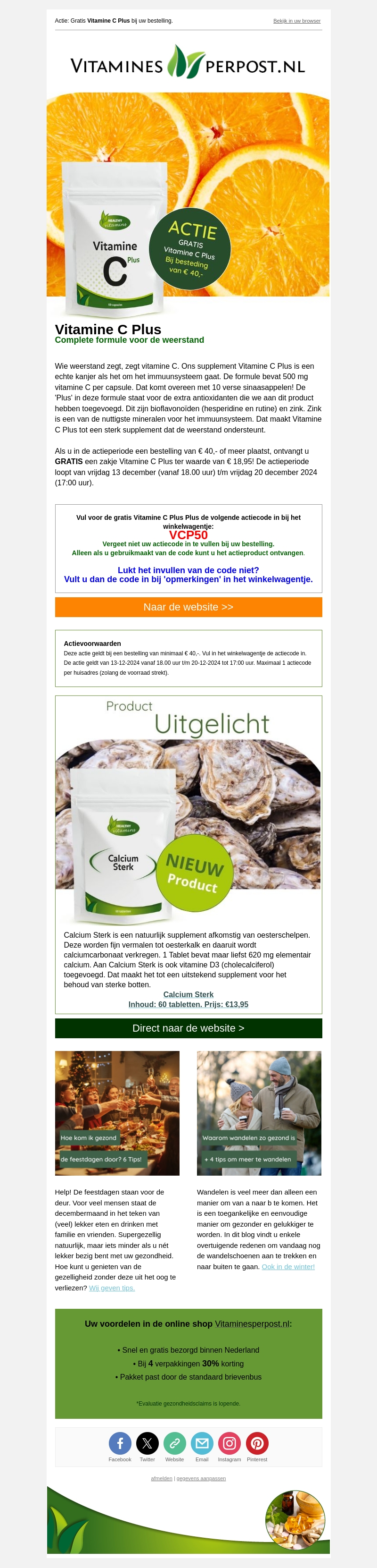Ontvang gratis een zakje Vitamine C Plus bij bestellingen van €40,- of meer. Dit krachtige supplement bevat extra antioxidanten en ondersteunt het immuunsysteem. De actie loopt van vrijdag 13 december t/m vrijdag 20 december 2024. Vergeet niet de code VCP50 in te vullen bij het afrekenen.