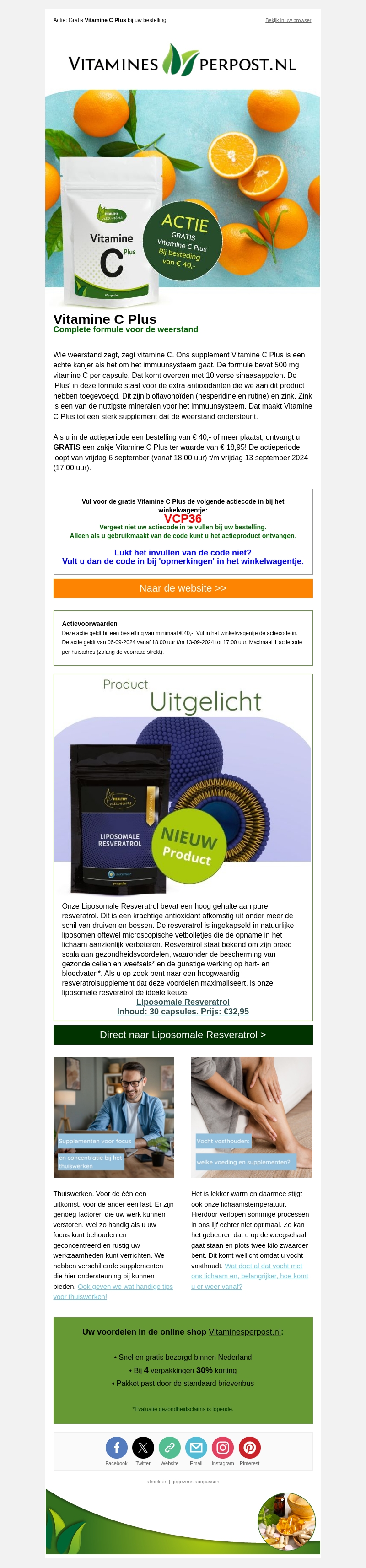 Profiteer nu van onze speciale actie: gratis Vitamine C Plus bij uw bestelling van minimaal €40 bij Vitaminesperpost.nl. Deze vitamine biedt een complete formule voor de weerstand, met toevoegingen zoals bioflavonoïden en zink. Plaats uw bestelling tussen 6 september 2024 en 13 september 2024 om in aanmerking te komen voor deze aanbieding.