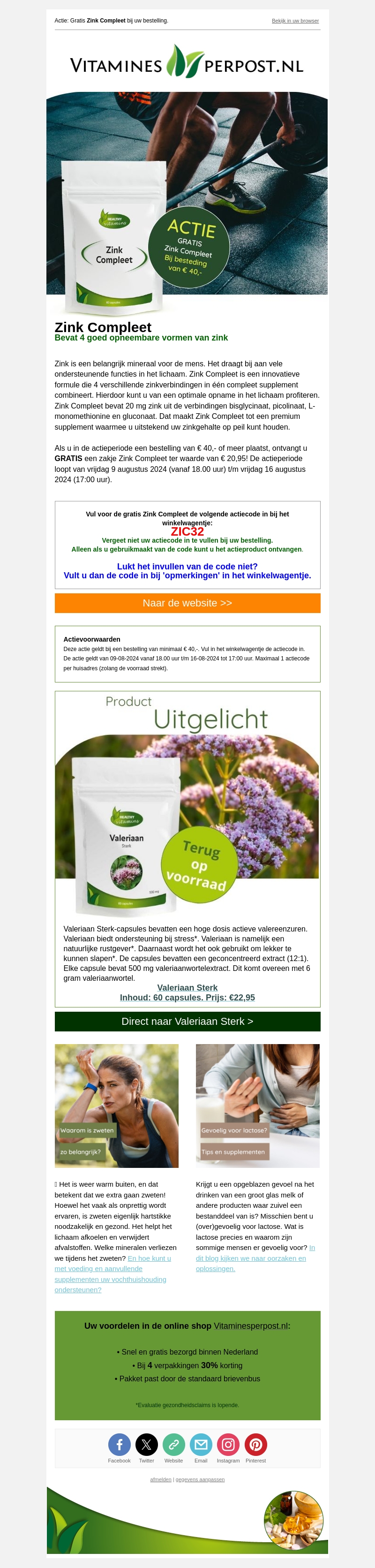 Ontvang gratis een zakje Zink Compleet bij een bestelling vanaf € 40. Zink Compleet bevordert uw gezondheid met vier goed opneembare vormen van zink. Deze actie is geldig van 9 augustus 2024 tot 16 augustus 2024. Gebruik de code ZIC32 bij uw bestelling. Bezoek nu onze website voor meer informatie.