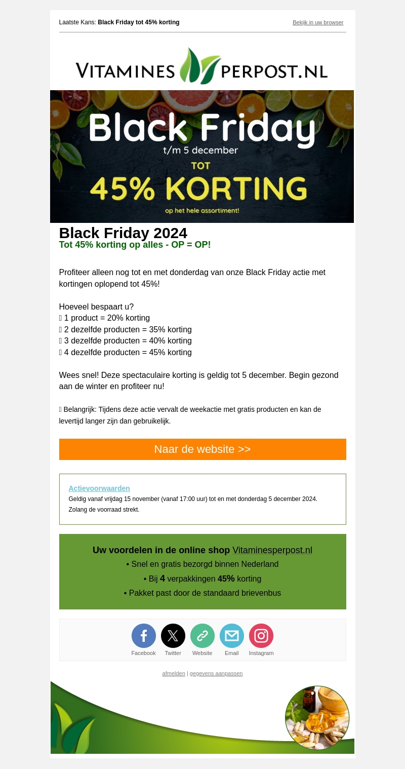 Geniet van geweldige kortingen tot 45% op Vitaminesperpost.nl tijdens onze Black Friday-actie. Bespaar op al uw favoriete producten: koop meer en krijg meer korting! Wees er snel bij, want de actie is geldig tot 5 december. Begin het seizoen gezond met onze topaanbiedingen. Lees verder voor de details en voorwaarden.