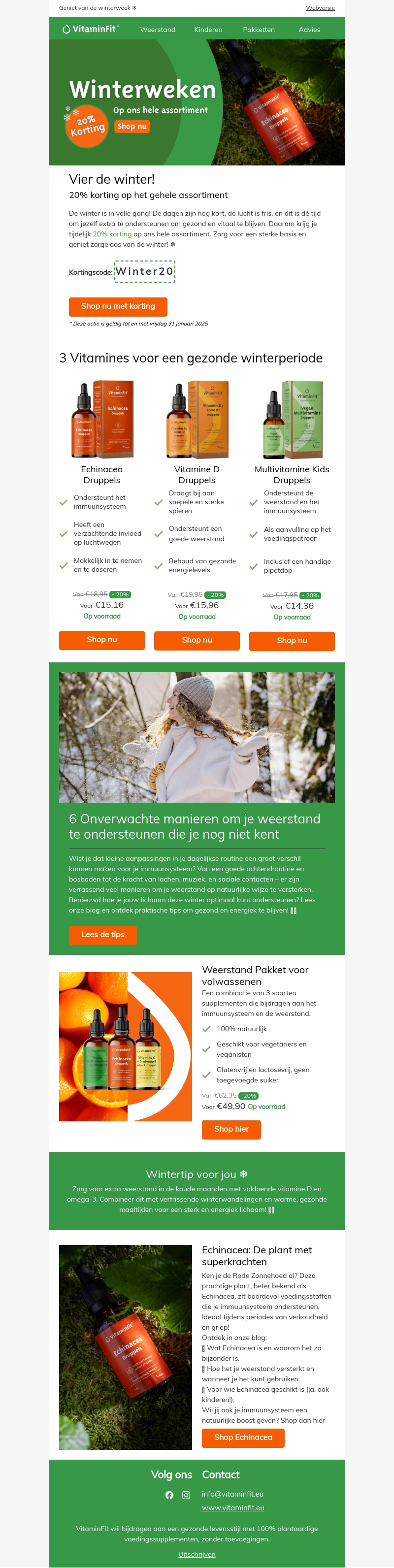 Mis de kans niet om tijdens de winter van 20% korting te profiteren op alle supplementen. Versterk je immuunsysteem met onze aanbevolen producten zoals Echinacea en Vitamine D druppels. Ontdek onverwachte manieren om je weerstand te ondersteunen en blijf energiek. Bezoek onze blog voor tips om je lichaam optimaal te versterken.