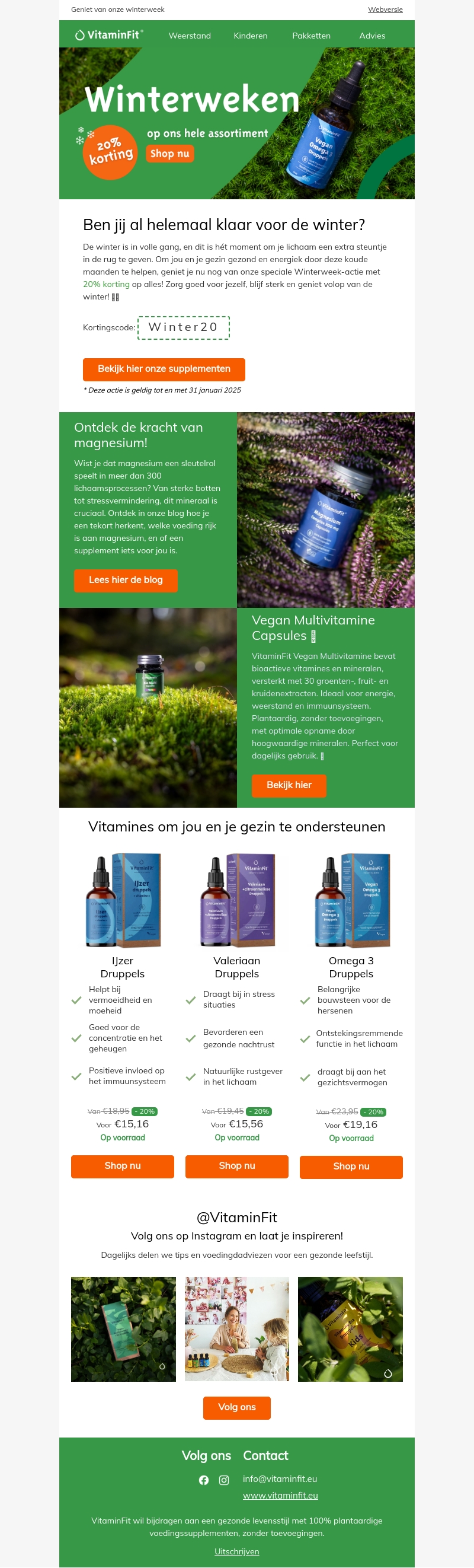De winter is in volle gang en VitaminFit biedt je een speciale 20% korting op het hele assortiment. Maak je klaar voor het koude seizoen met essentiële vitamines en mineralen. Duik in onze blog voor meer informatie over magnesium en ontdek onze Vegan Multivitamine Capsules. Geniet samen met je gezin van extra ondersteuning voor het immuunsysteem. Bekijk nu onze aanbiedingen.