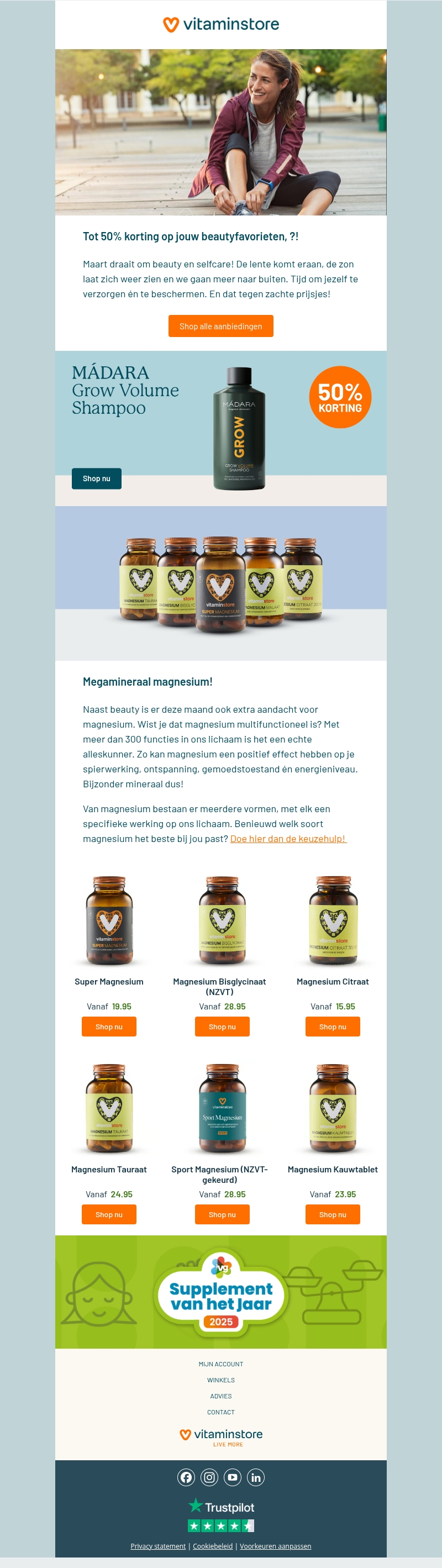 Bij Vitaminstore profiteer je nu van tot wel 50% korting op al je beautyfavorieten. De lente staat voor de deur, dus tijd om jezelf te verwennen en te beschermen met onze geweldige aanbiedingen. Ontdek ook onze speciale aandacht voor magnesium, een essentieel mineraal voor je welzijn. Mis deze kans niet en shop nu jouw favorieten tegen scherpe prijzen. Bezoek onze website voor meer informatie en exclusieve deals.