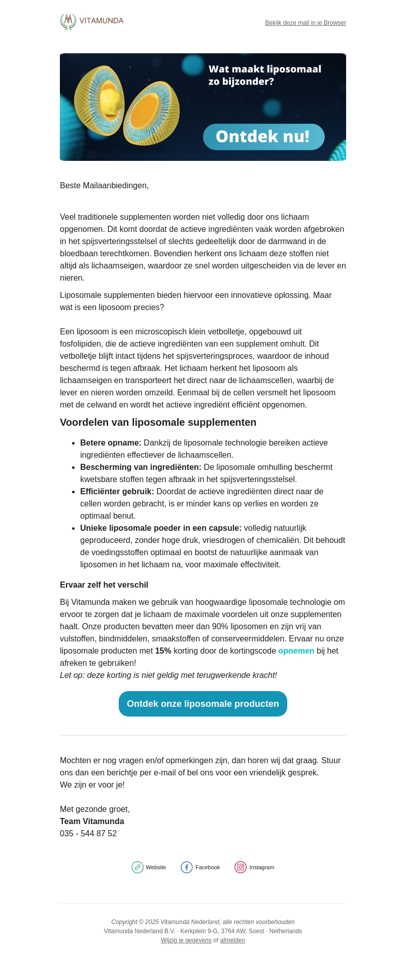 Liposomale supplementen bieden een innovatieve oplossing voor een betere opname in het lichaam. Dankzij de liposomen worden actieve ingrediënten beschermd tegen afbraak en direct naar de lichaamscellen getransporteerd. Dit resulteert in efficiënter gebruik en maximale effectiviteit. Profiteer nu van 15% korting bij Vitamunda op onze hoogwaardige liposomale producten.