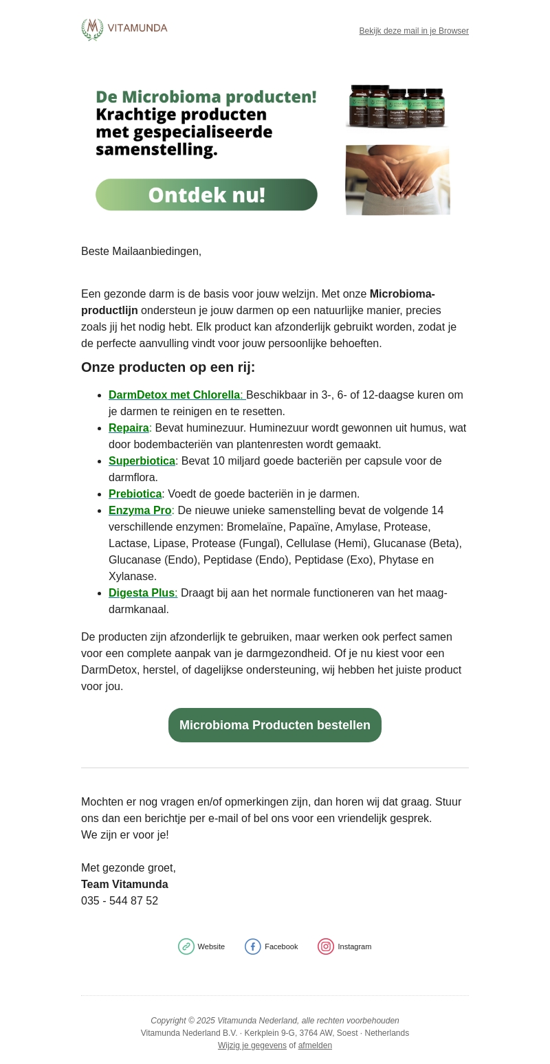 Een gezonde darm is essentieel voor jouw welzijn. Ontdek onze krachtige Microbioma-productlijn die je darmen op een natuurlijke manier ondersteunt. Van DarmDetox tot Prebiotica, wij hebben de perfecte producten voor jouw persoonlijke behoeften. Elk product werkt afzonderlijk of samen voor optimale darmgezondheid.